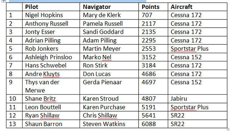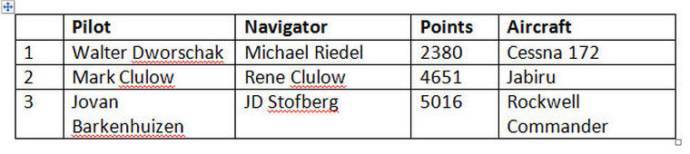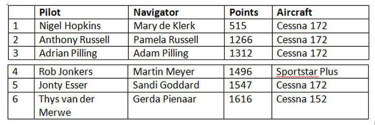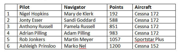 Friday’s weather was somewhat clearer, so it was decided to fly the “Bad Weather” route, which took the teams to the North of Stellenbosch, in a clockwise track towards the coast, narrowly skirting around the South of Fisantekraal, then Eastward towards Riebeeck-Kasteel, following the railway line towards Wellington, then heading back towards Stellenbosch. Navigation in this area was very difficult, especially for up-country pilots who are not used to the small farms and details in the terrain.The results for Day 1 were: