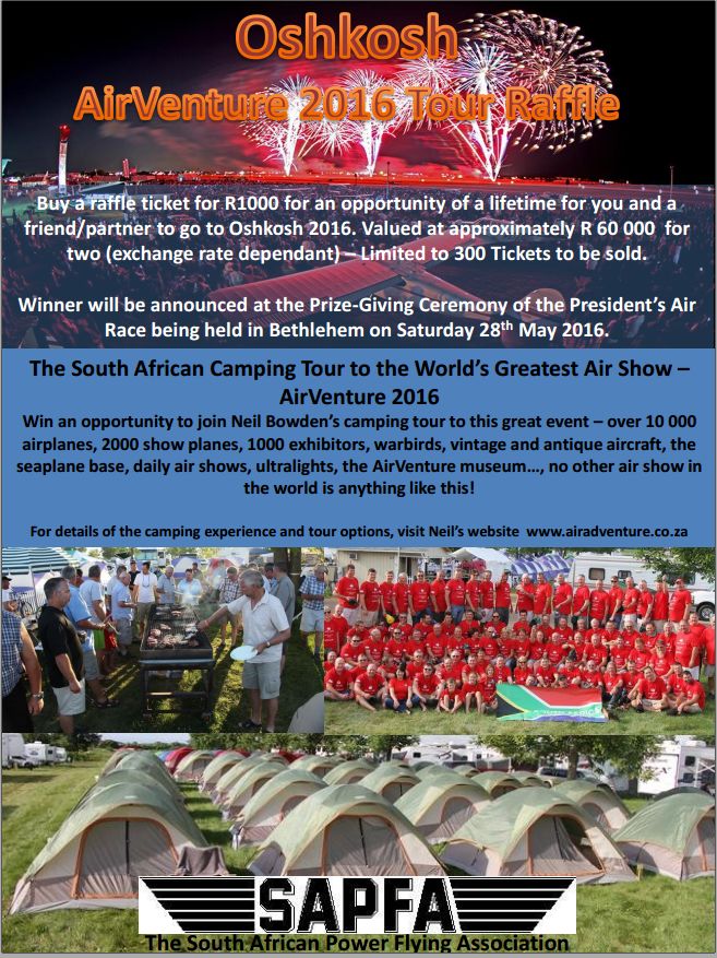 The South African National Rally Flying Team and Neil Bowden’s AirAdventure tour group (www.airadventure.co.za) have put up an opportunity of a lifetime to attend Oshkosh AirVenture 2016 to be held from the 23rd of July to 1st of August 2016 by offering a raffle ticket of R1000 for a trip for two to this event which includes air fares and camping in the unique South African campsite.