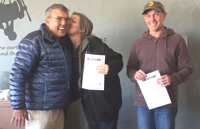 A very grateful third place kiss from Chief Flying Instructor Telani Lithgow and Johan Riekert.