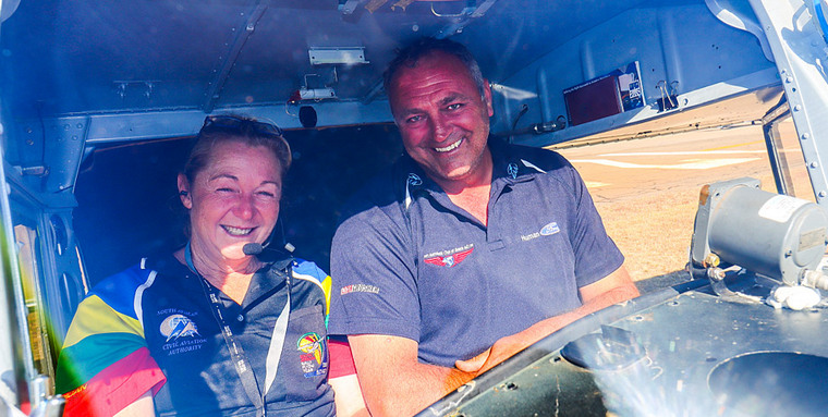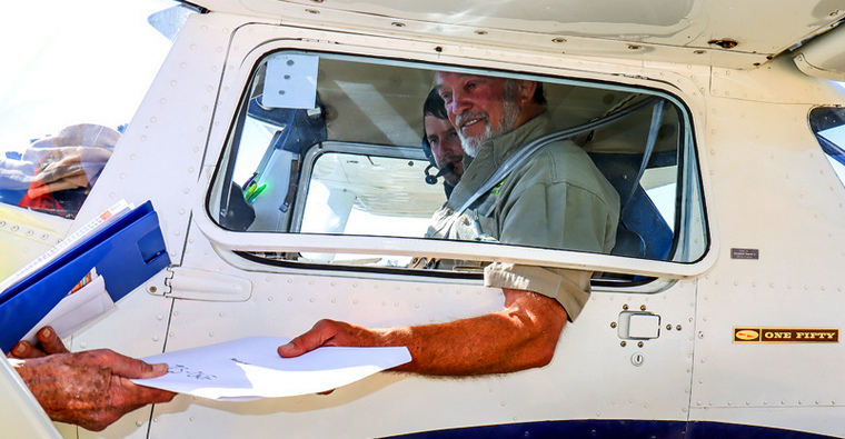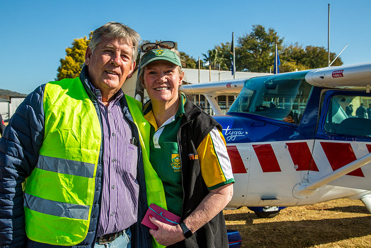 Laura and Stuart McDermid receiving their envelope of instructions, with their dog comfortably accommodated behind them, taking off and landing in ZS-MJB.