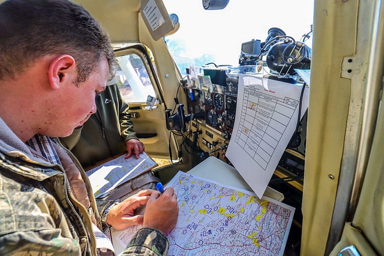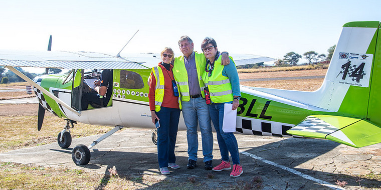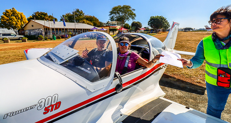 Nigel Hopkins and Mary de Klerk receive their envelop of instructions, taking off and “arriving” in ZS-PVY.