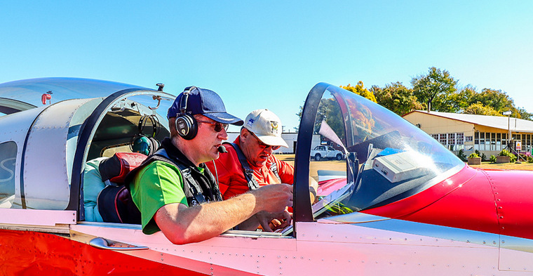 Hans Schwebel and Ron Stirk with their heads down studying their instructions, taking off and landing – last, but not least, as they shared ZS-NBT and had to wait for its return.