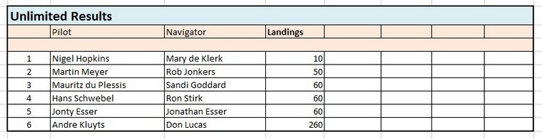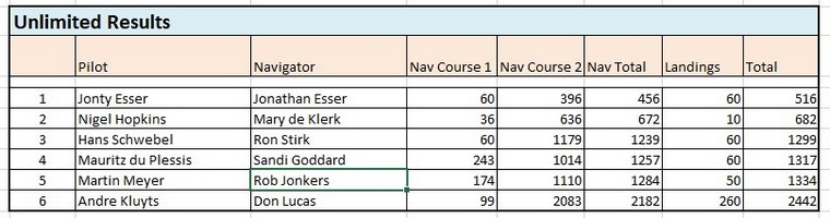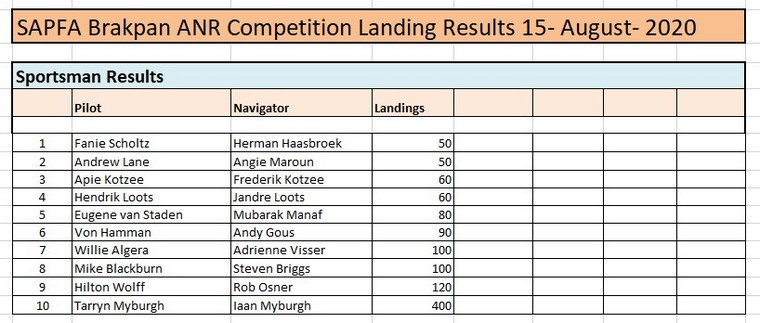 For the landings both landings counted towards a score, landing before the line attracting more penalties than after the line. In the Sportsman class in 1st place were Fanie Scholtz & Herman Haasbroek, in 2nd place Andrew lane & Angie Maroun and in 3rd place Apie & Frederik Kotzee. In the Unlimited class in 1st place were Nigel Hopkins and Mary de Klerk, in 2nd place Martin Meyer and Rob Jonkers and in 3rd place Mauritz du Plessis & Sandi Goddard.
