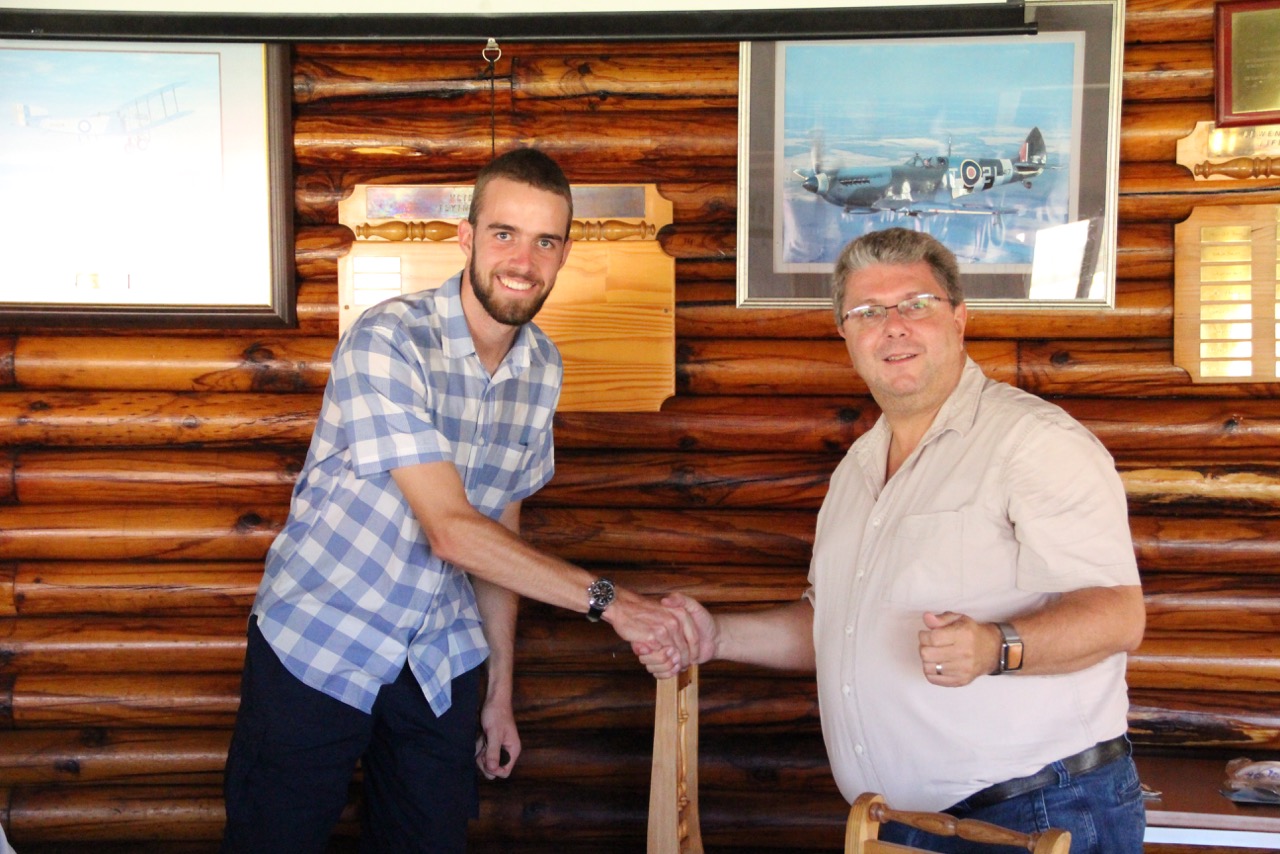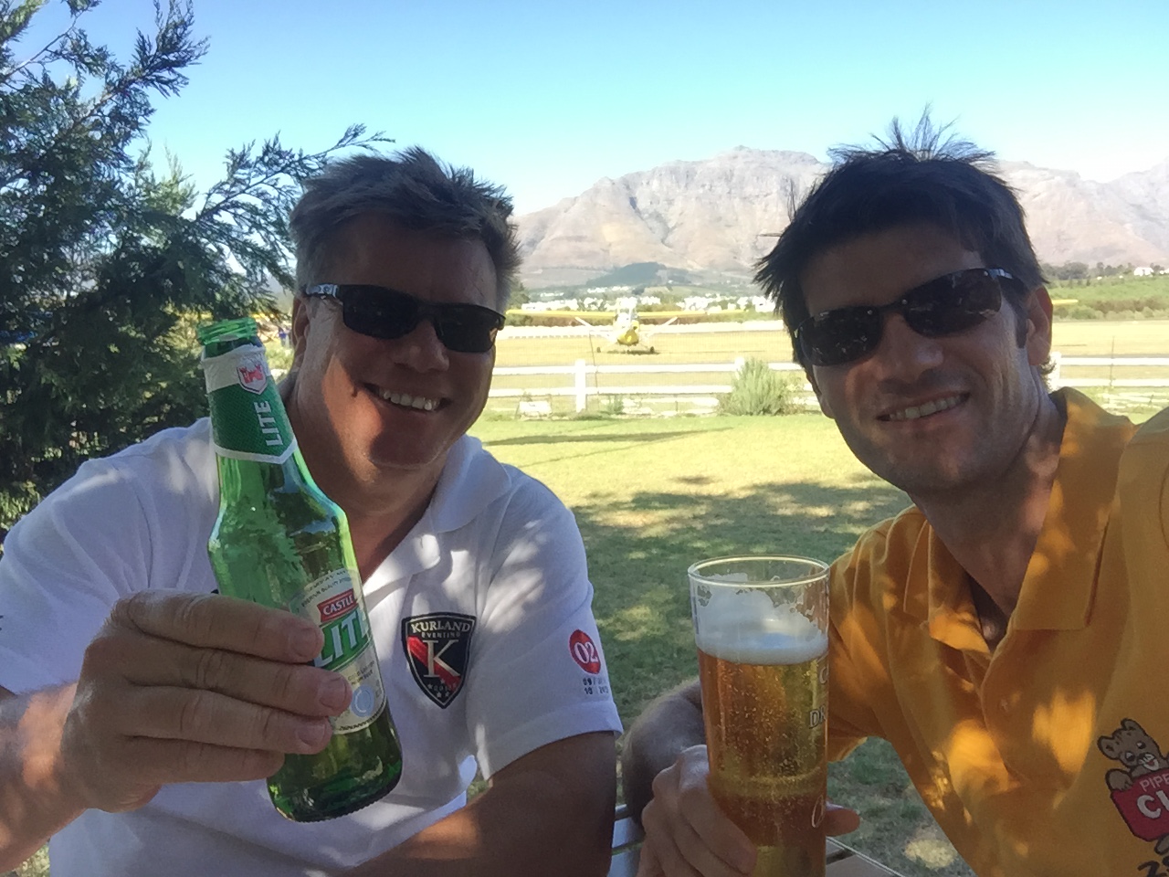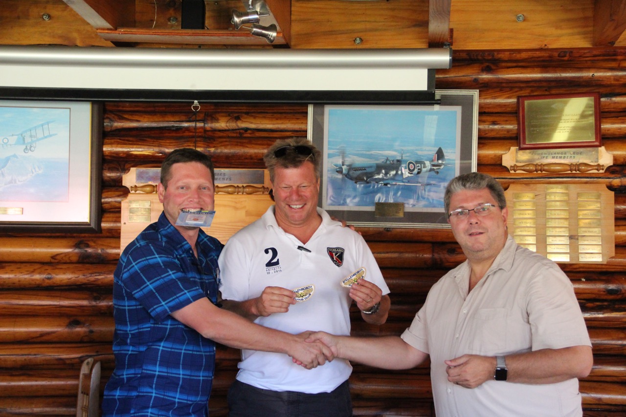 Part of the challenge was a spot landing back at Stellenbosch! To no surprise Piet is making a fine aviator out of Alan as he nailed the landing by landing a mere 1 meter from the line giving him first place in that category! Tony congratulating the winners.